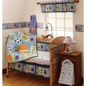 94004V Features: -Sports themed bedding and accessories in blue. Includes: -Four Piece Bedding Set includes a fitted sheet, bumper, quilt, and dust ruffle.