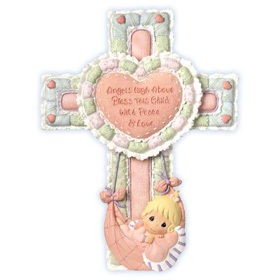 Precious Moments Precious Little Blessings Baby Cross with Stand-(Girl) with the sentiment "Angels High Above Bless this Child With Peace And Love"