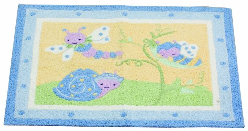 1800RUG Whimsical snails, bumble bees, and dragonflies play together in a colorful meadow. These adorable bugs are great for both boys and girls. Snug as a bug in a rug is reality on this Snug as a Bug Rug! Caricatures of a happy dragonfly, smiling snail and sleepy bumble bee on a beautiful array of soft blues, greens, peach and white, will fascinate your little one. The rug will create a soft and comfortable area in your nursery. This delightful floor decoration will add a sweet atmosphere to your child's bedroom or nursery. Features: -Snug as a Bug collection. -Made with a soft 37% olefin, 35% acrylic, 28% polyester blend. -Create soft and comfortable. -Non-skid backing. -Machine wash.