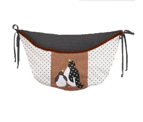 Features the mother and baby penguin framed on the white with black dot fabric, with an accent cord in tundra red velvet and bias ties and lining in small black dot.