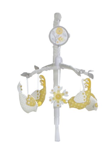 MiGi sweet sunshine musical crib mobile features plush birds and flowers in a sophisticated neutral palette of grey and yellow that rotates as the mobile plays a soothing lullaby. Features: fabric covered music box and armature. Adjustable attachment fits most crib rail formats. Designed by the MiGi girls, michele adams and gia russo, who are moms to toddlers. Other sweet sunshine products sold separately: 3 piece crib bedding set, crib bumper, window valance, baby blanket, diaper stacker, crib sheet.