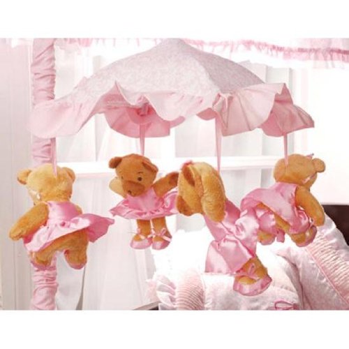 The Twirling Around Nursery Musical Mobile features a ballet teddy bear design theme in shades of pink, brown and cream.