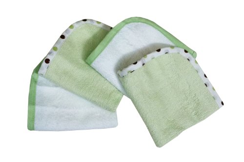 The 4-pack 100% organic cotton terry washcloth set is ideal for your little one's bath. It is extra soft and is trimmed in coordinating 100% percale cotton. Set includes four generously sized 10" X 10" washcloths, two-white with celery trim and two Celery with coordinating polka dot trim. Machine wash with like colors. Tumble dry low for best results